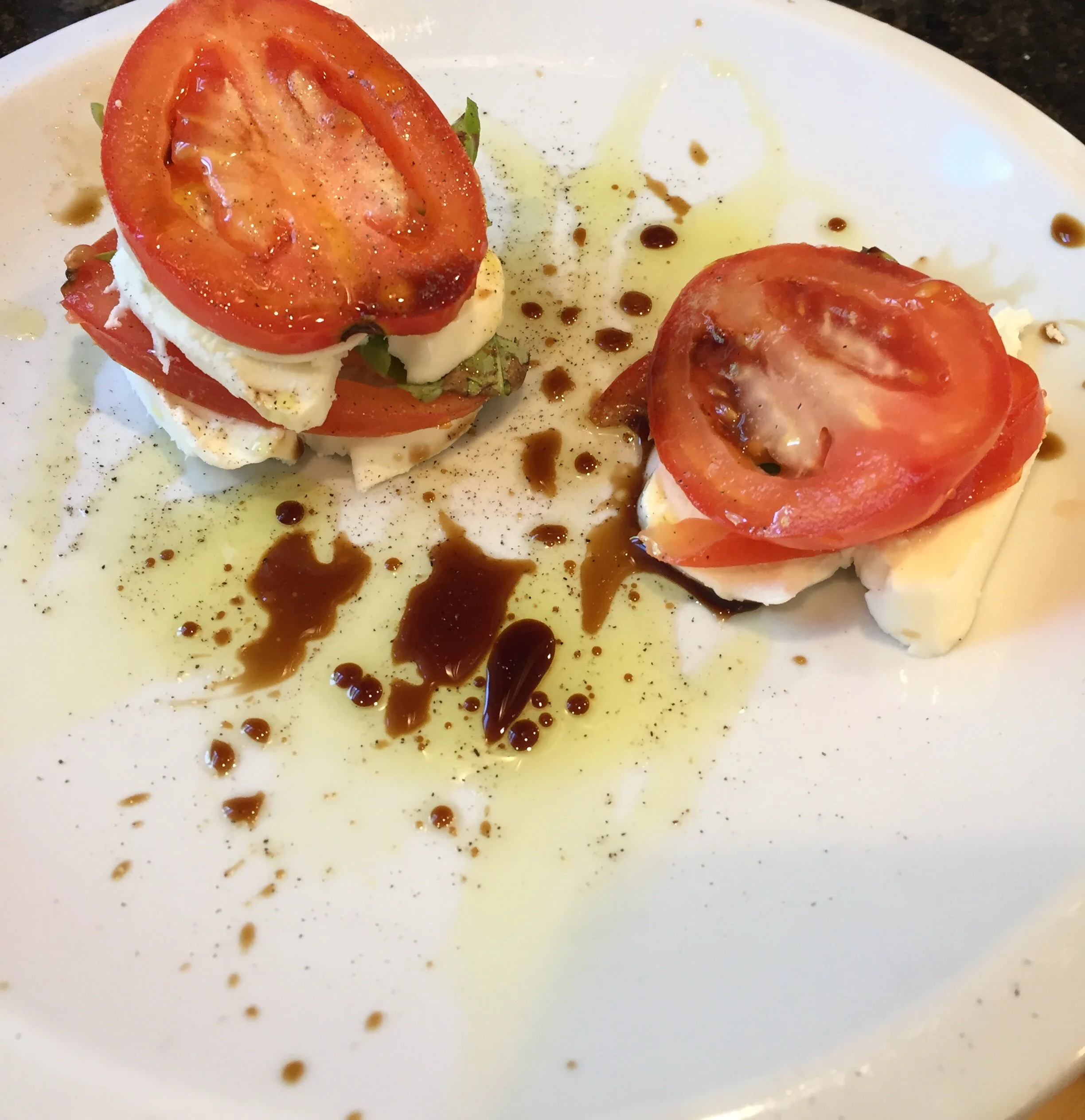 I slice tomato, mozzarella, 2-3 slices per tower.