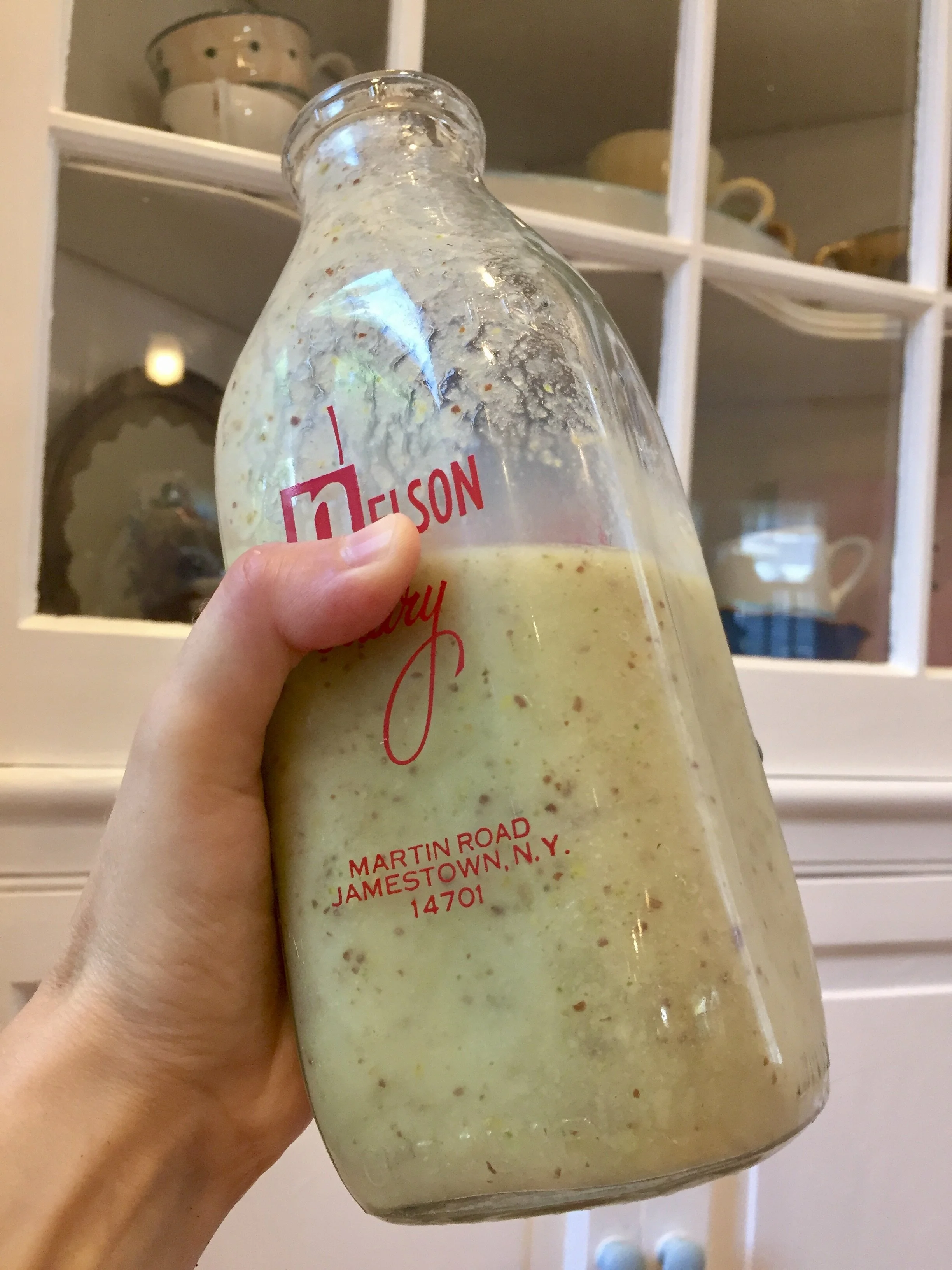 This is my refreshing, flavorful and packed with vitamins (B, C, D, A, E), minerals and proteins breakfast smoothie. And of course I serve it in sustainable, recyclable, very elegant old-fashion glass milk bottle.