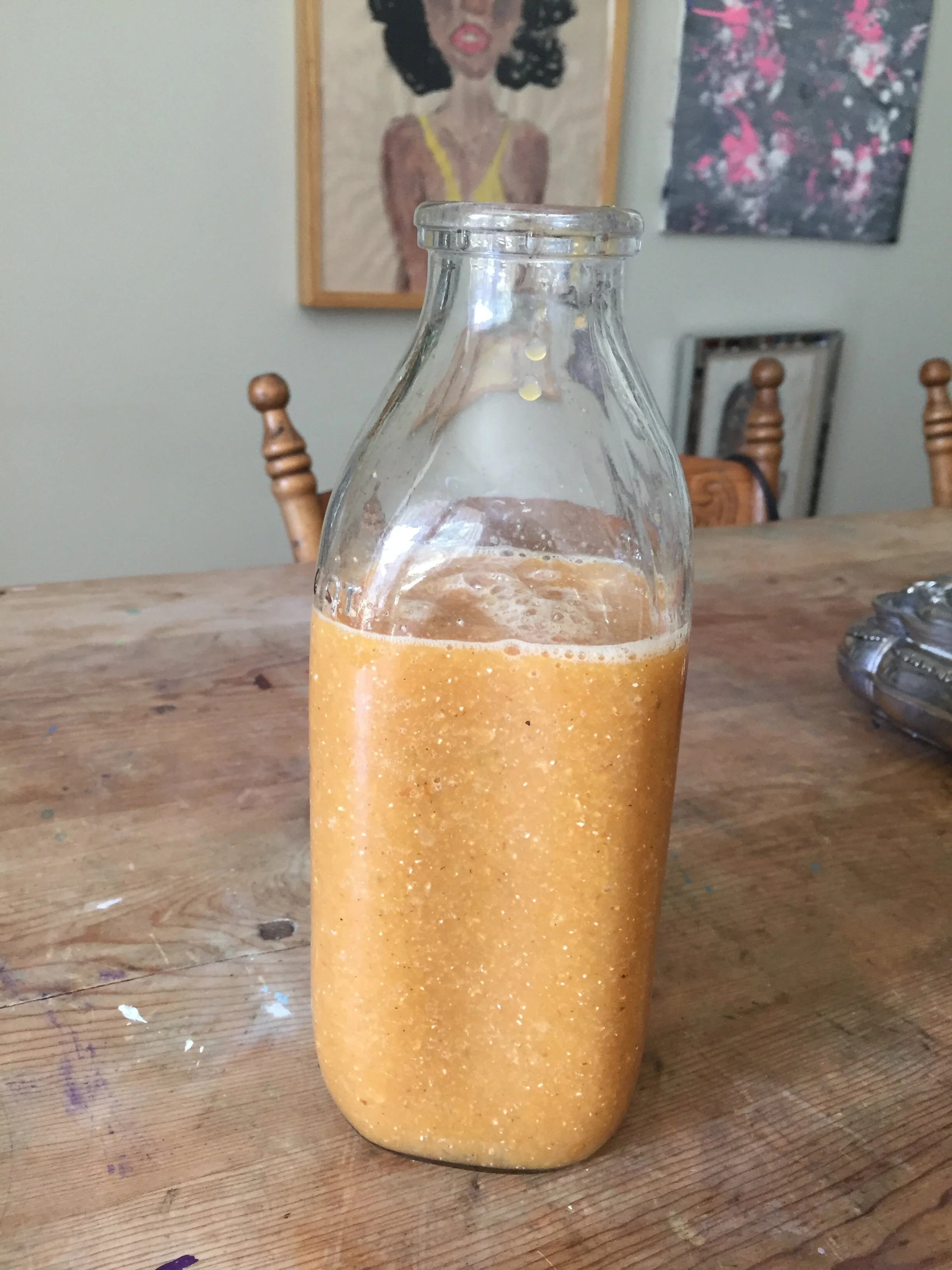 I had unsettled stomach yesterday after pizza sauce that was very acidic, and ginger is well known for its stomach soothing properties, while a pinch of turmeric with its anti-inflammatory properties not only elevated the quality, but also color of this yummy drink. The art of making such liquids is in proportions, as too much of any ingredient can overwhelm the product and you will end up with less than tasty drink.